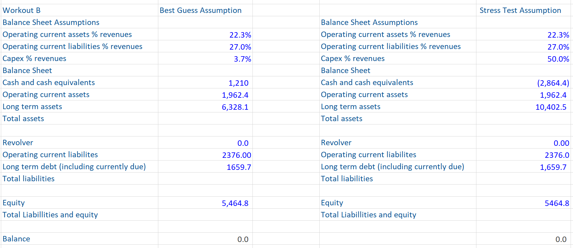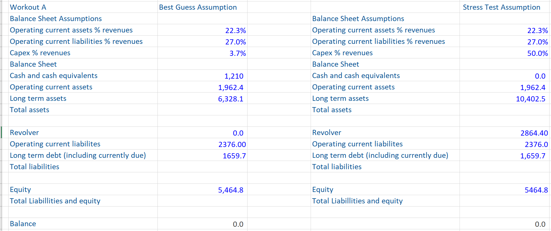 Note that once the balance sheet balances, the entire model should be checked in detail using these three checking techniques. Stress testing the entire model at this stage is very powerful and will often find subtle errors or those that are not causing an obvious problem. Remember to always stress test assumptions that are likely to change or which are currently producing a zero amount in the income or cash flow statements (or an amount equal to the historical data in the balance sheet).