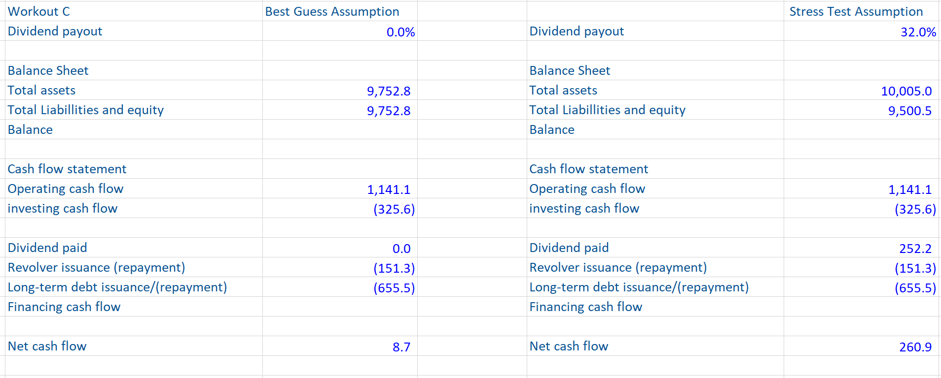 - Change in assumption: for example, change the CAPEX as a % of sales assumption from 3.7% to 50% (i.e. make an extreme change, where the output effect can easily be seen)