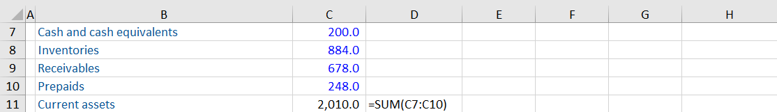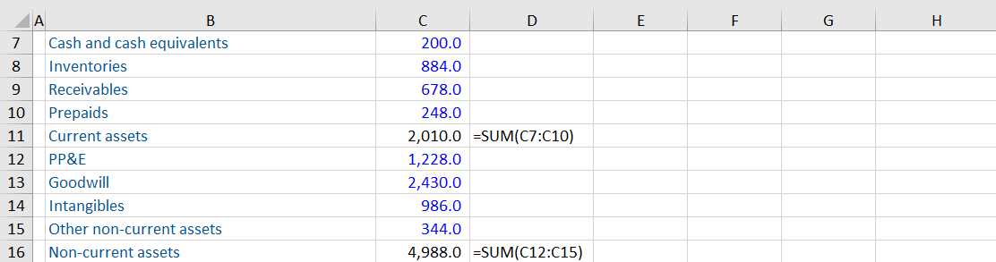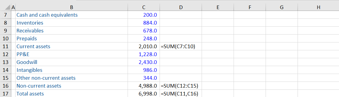 The following illustration indicates that the SUM function shortcut has been activated with the cursor in cell C17. Excel has guessed correctly that the sum should use the data that is above cell C17. However, it has chosen the prior two subtotals for current assets and non-current assets. This is because the formula immediately above is a SUM function. As a consequence, Excel assumes the user wants to sum the subtotals. In this case, current and non-current assets are summed to arrive at total assets.