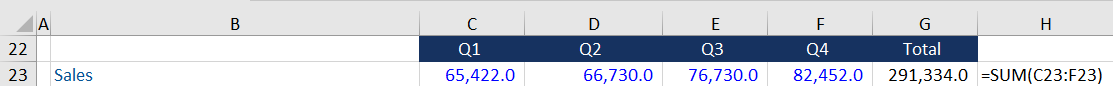 Finally, Excel’s default assumption is that the data to be added is above the answer cell and it will always check this first. If there is a text header or a blank row immediately above the answer cell, then it will assume that the user wants to add from the left; therefore, it will check values to the left of the answer cell. In the illustration below, the answer cell is in G23 and there is a text header in B23, which means when the SUM shortcut is activated, Excel includes the data from C23 to F23.