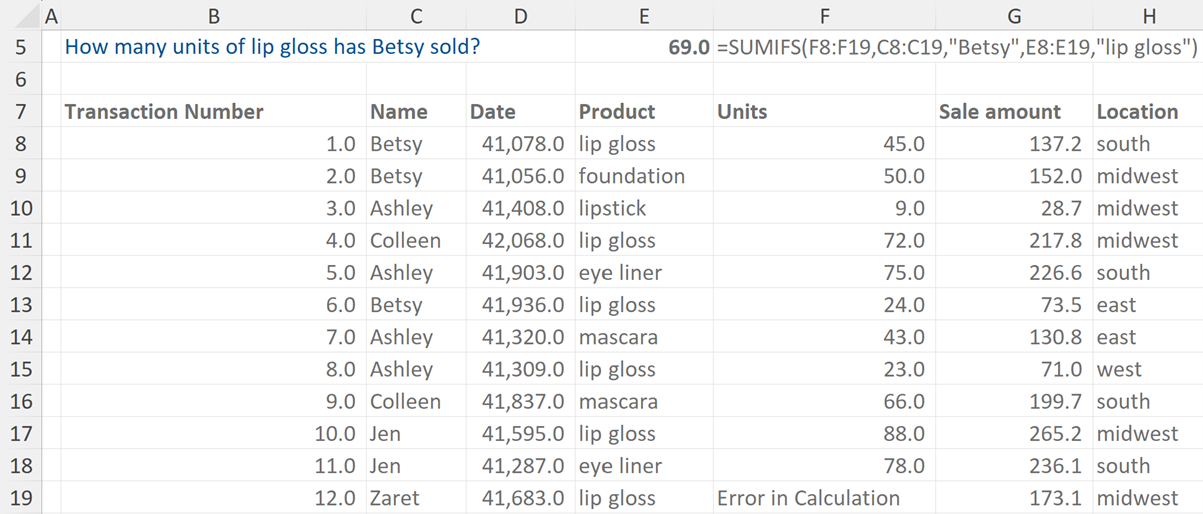 We can see in the formula shown below that the units are selected first (the column to be summed), then Betsy (IF criteria 1), then lip gloss (IF criteria 2).