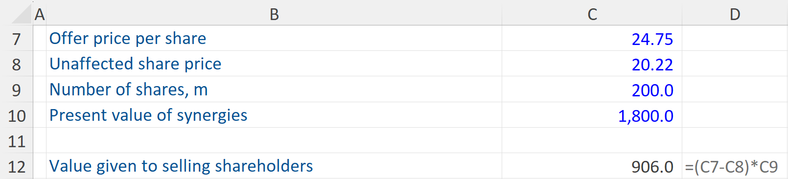 So let’s calculate the value given to the existing shareholders. The calculation involves multiplying the difference between the offer share price and the unaffected share price with the number of shares.