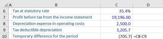 The company’s depreciation expense in its income statement, calculated using its own accounting policy, is 2,500. However, the depreciation expense allowable by tax authorities is 3,205.7. This leads to a temporary difference of 705.7 for the period.