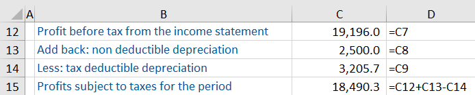 In order to calculate the deferred tax balance sheet amount, we need to calculate the profit subject to taxes following the tax authority rules. We do this by adding the non-deductible depreciation to the profit before tax from the income statement to remove its effect and subtracting the tax-deductible depreciation instead.