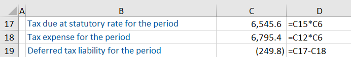 Based on this calculation, the profit subject to taxes for the period are 18,490.3. Using this information, we can calculate the deferred tax amount, which is the difference between the tax expense (as per the accounting policy) and the tax due at the statutory rate for the period. This will be a deferred tax liability, since the profit before tax in the income statement is higher than the profits subject to taxes (under the tax authority rules), means less tax will be paid in cash than is shown as an expense in the income statement. As such, more tax will need to be paid in cash in the future.