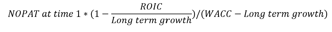 The perpetuity can then be safely based on this altered year. This will pull ROIC and other assumptions into alignment even if the last explicit forecast year wasn’t representative. Note that care would need to be taken with the growth perpetuity formula when using a terminus. If the terminus is a recast final year, then the growth perpetuity would need a (1+g) on top. If the terminus is the next year, then the growth perpetuity would not need a (1+g). There’s more detail on how growth perpetuities work later in the blog, which may help you understand why a (1+g) plays a role here.