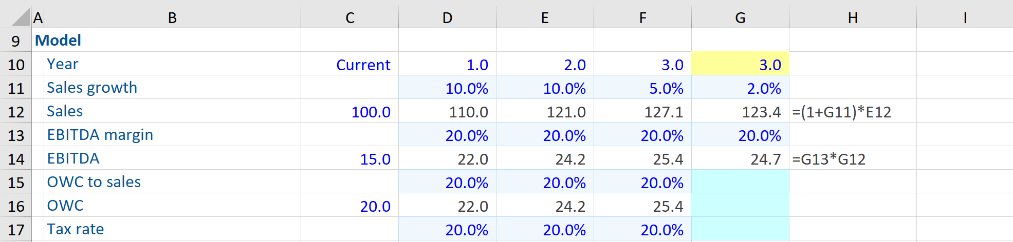 The modeler has created a three-year forecast. They’ve used some sensible (if simple!) assumptions and ended up with EBITDA figures. However, EBITDA isn’t something you should be discounting. The next step is generating free cash flows (FCF), which are compatible with the weighted average cost of capital (WACC) to determine present value (PV). Notice the starting point is the EBITDA from the income statement above.