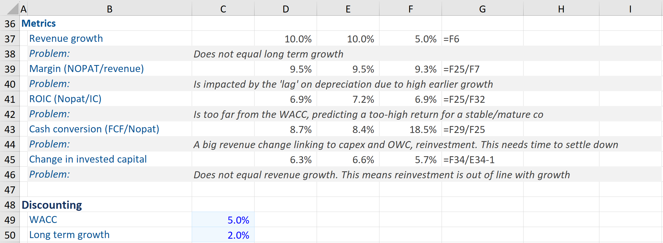 | Revenue growth | Should match long-term growth (used in the growth perpetuity) by the final year. If not there’s a mismatch between the growth (and reinvestment) in the final FCF and the subsequent growth that’s predicted in the perpetuity |