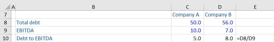 In the above example, Company A has a lower debt to EBITDA ratio than Company B, which indicates that its (i.e. the former’s) borrowing capacity is higher.