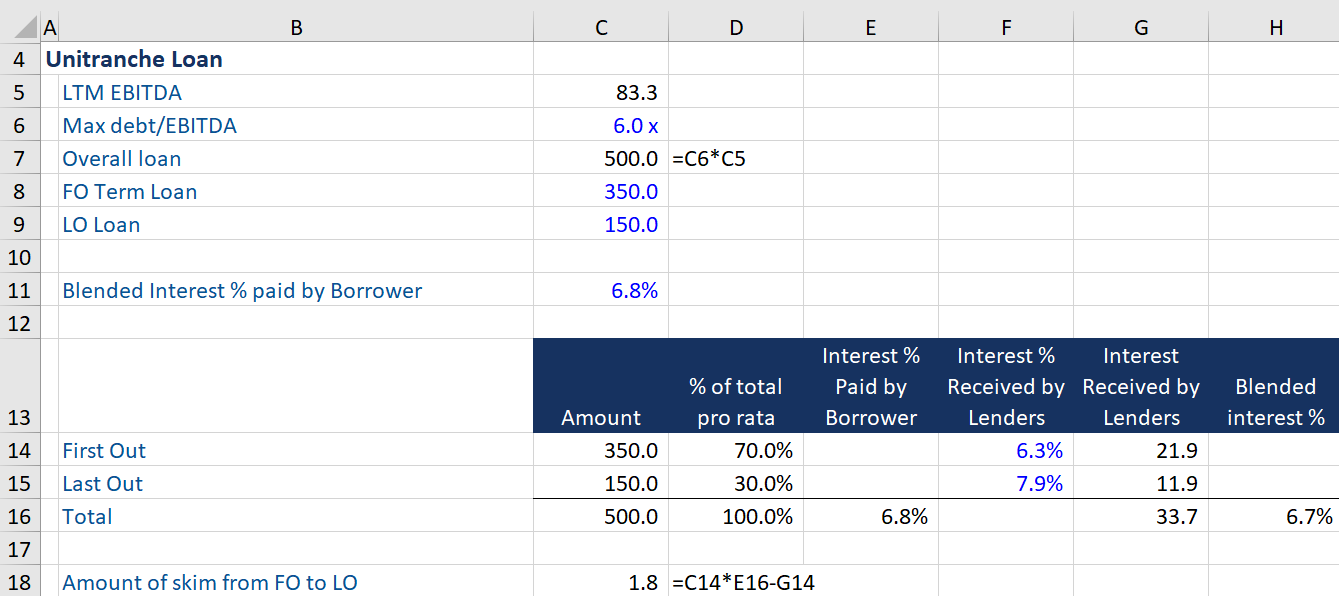 In the example above, we can see the calculation of the blended interest cost and skim on a typical bifurcated unitranche deal (excluding fees, etc). The borrower is only responsible to pay the 6.75%, which is the AIC of the loan. However, the loan has a First Out carveout which offers a 6.25% yield and Last Out carveout offering 7.92%. The issuer, represented here in the First Out carveout, will receive all of the interest and needs to skim some of the First Out payment to pass along to the Last Out investors to increase their yield.