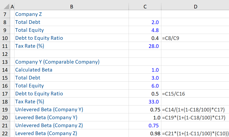 Finally, we assume that the unlevered beta of the comparable company (Company Y) is the same as that of Company Z (i.e. 0.75), given that both companies are comparable (as stated above). We have adjusted the unlevered beta of Company Z for its leverage, to get the levered beta value of 0.98.