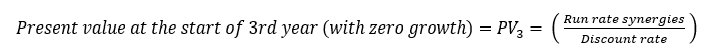 - Assume synergies to accrue from the third year onwards, they need to be further discounted for two years using the above calculated discount rate.