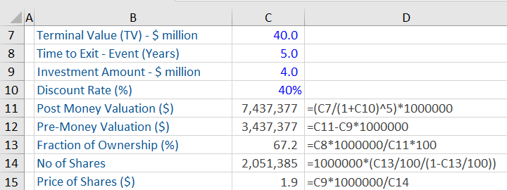 For this, certain assumptions have to be made regarding the terminal value of the company (i.e. $40 million is what is expected by the set-up team), time of exit, the amount of money that company A wants to raise currently from the VCF, which is $4 million.