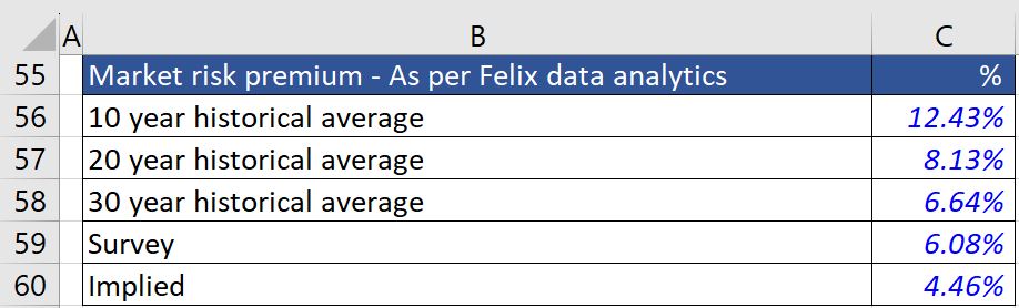 We have picked 6.64% as the market risk premium. However, sensitivity analysis has been performed later in this blog to illustrate the impact of the changes in market risk premium to WACC.