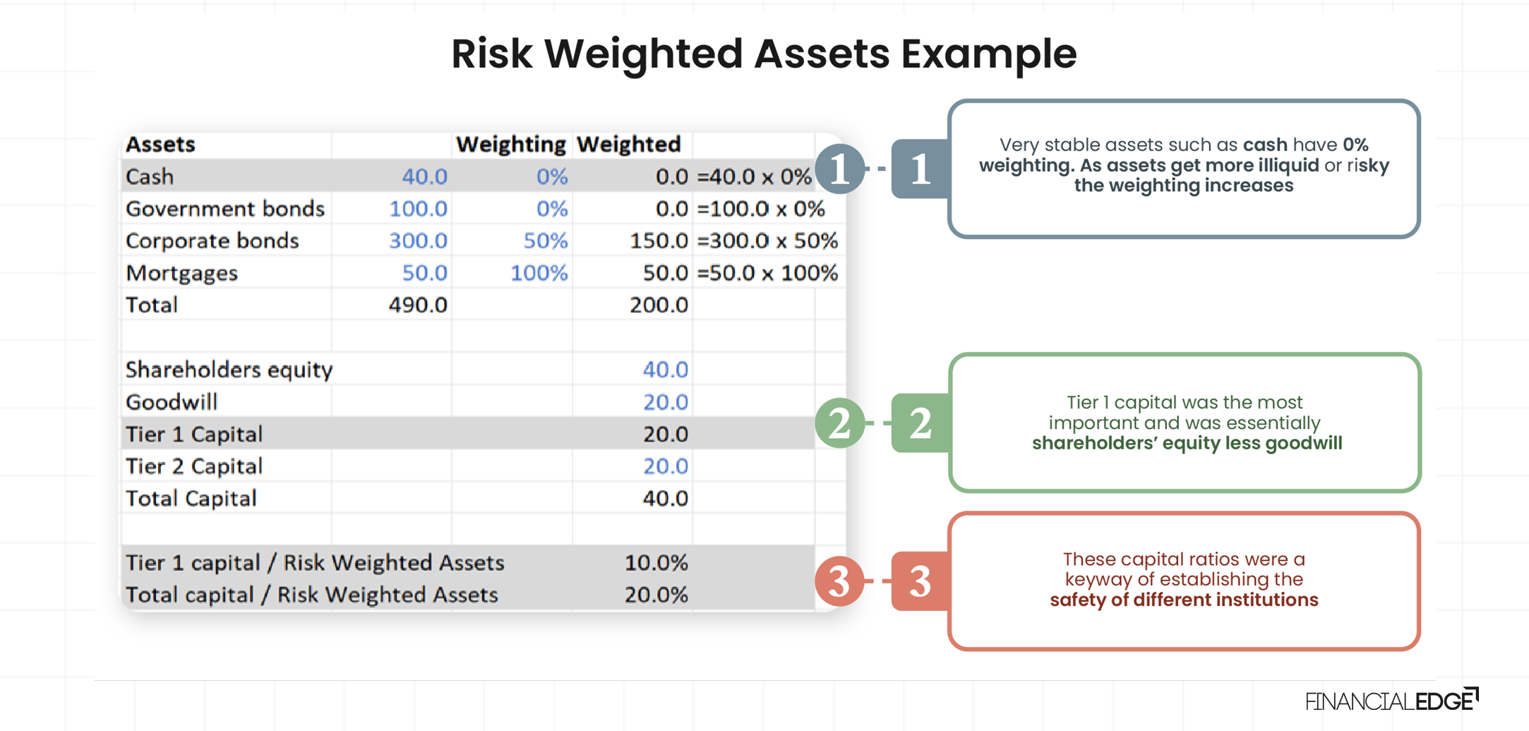 Different asset classes held by banks carried different risk weights. For example, cash and government bonds, which have no material credit risk, had a 0% weighting. When this 0% risk weighting is multiplied by the amount of cash and government bond positions (40 and 100 respectively), the RWA is 0, meaning no capital buffer is needed for these assets. This is logical since the risk of losing money from credit defaults on these assets is assumed to be 0, so no capital needs to be held.