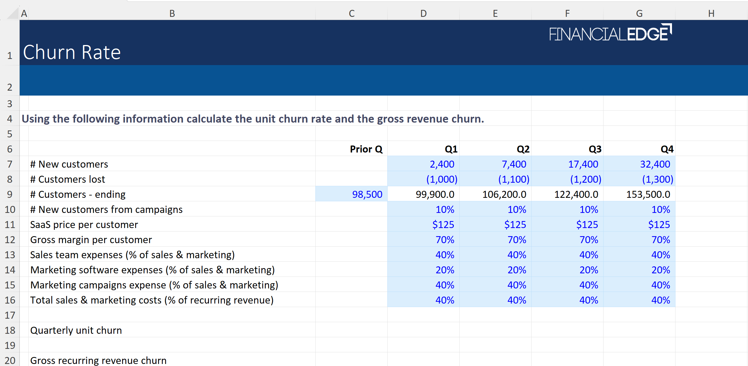 Using the template with the information provided below we can calculate the future unit churn rate and the gross revenue churn of a company.