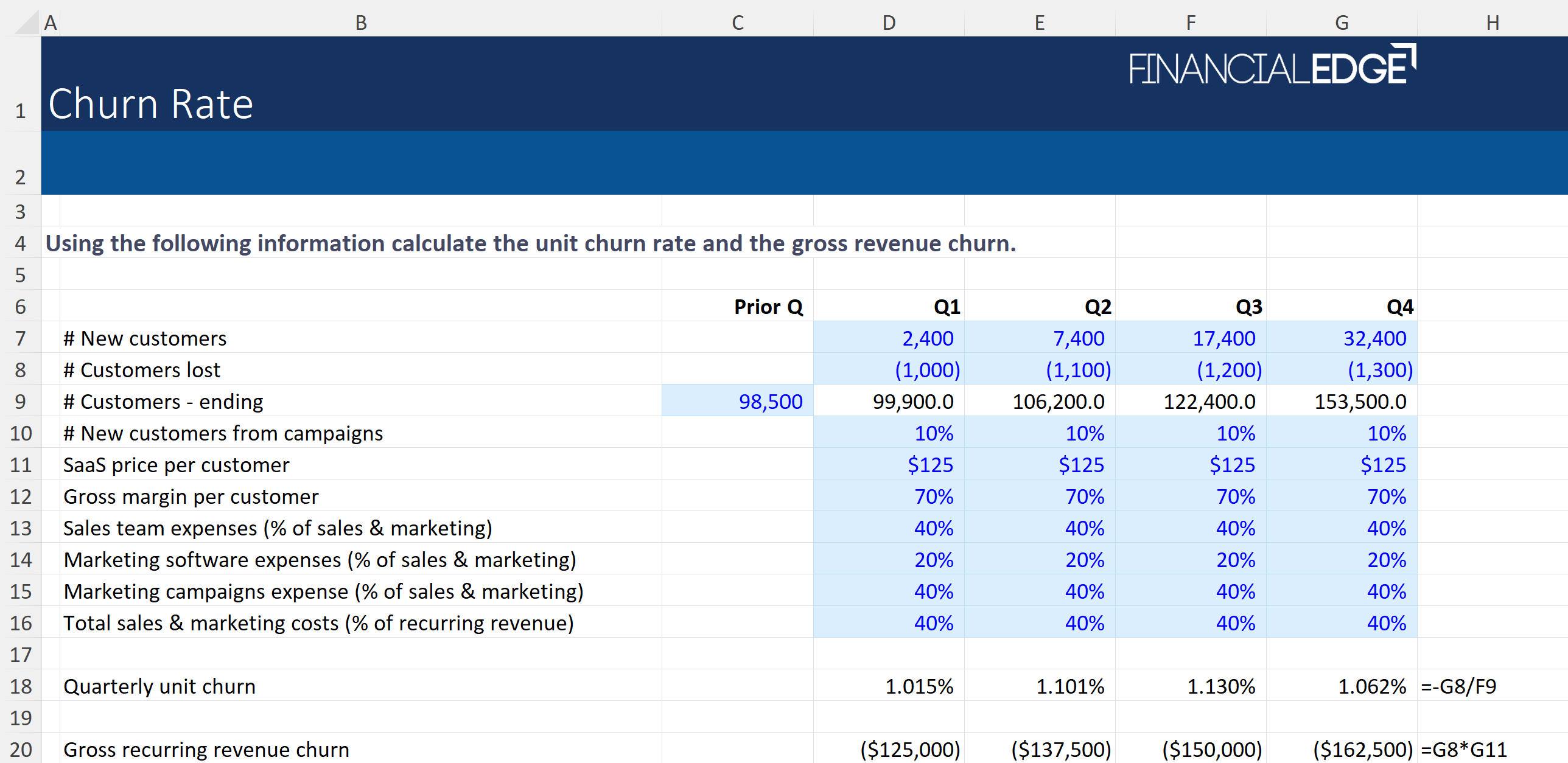 To calculate the gross recurring revenue churn, this is simply the number of customers lost multiplied by the SaaS price per customer. So, in Q1, that would be 1000 customers x $125 per customer, so the revenue churn would be $125,000.