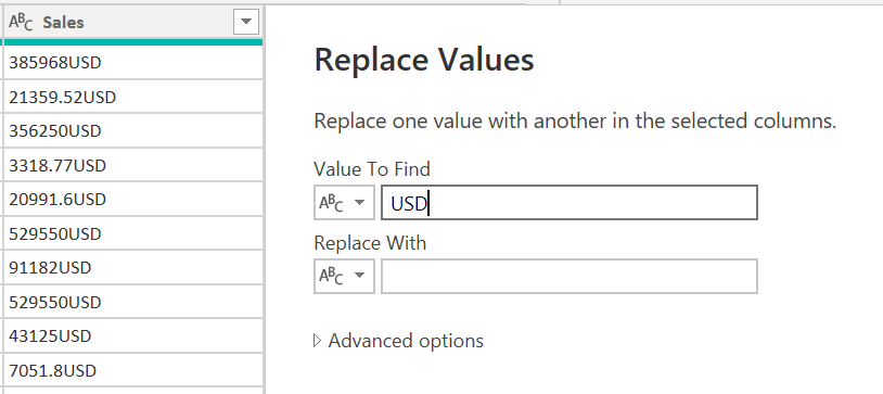 You can also use Replace values to remove unwanted characters. So in this example, the values all contain the same text string “USD” at the end. This would prevent any calculations from being done on the data. You could use Replace Values to replace “USD” with nothing and then convert the column to a numeric data type: