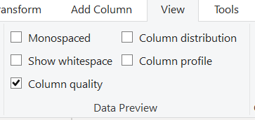 Power BI Query Editor has a really useful tool called Column Profiling. This allows you to check what percentage of a column contains errors or blanks. One or two errors/blanks in a column containing 1000’s of values is not a big problem. But if you discover that 75% of the column contained blanks, you might decide not to use it in your analysis or perhaps see if you can locate the missing data elsewhere. The View Tab in Query Editor will turn on Column Quality so you can see how many VALID values, ERRORS, and BLANKS (EMPTY) exist in a column.