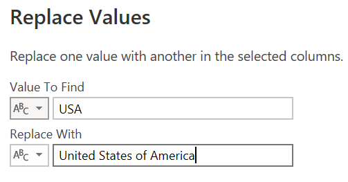 This is a really useful way to correct typing or spelling mistakes to help make the data values consistent. So for example, you can use Replace Values to change all occurrences of “USA” to “The United States of America”