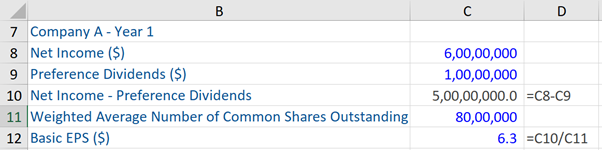 Basic EPS = Net income – Preference shareholders / Weighted average number of common shares outstanding