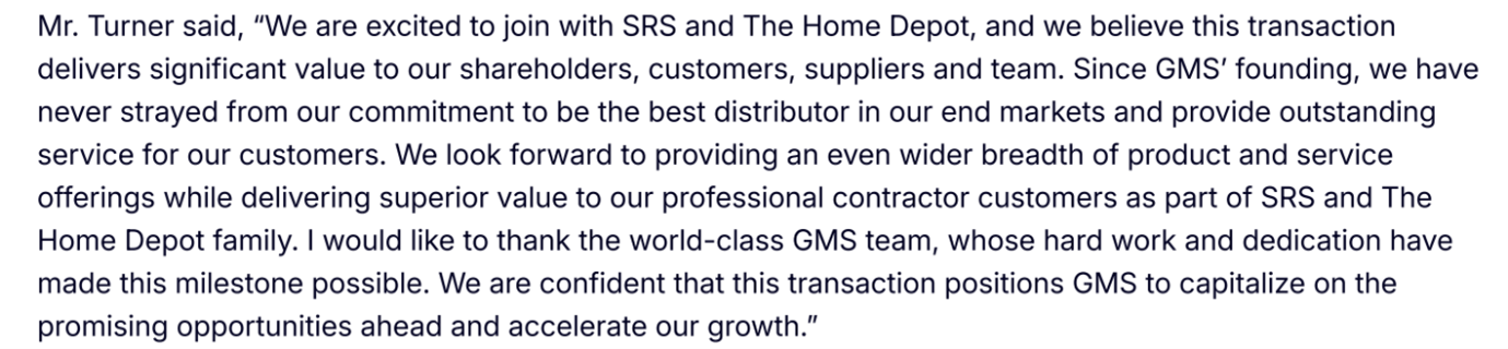 GMS’s board, led by Chair John J. Gavin, evaluated both offers and concluded that the Home Depot-SRS proposal was in the best interest of shareholders and stakeholders. The board cited the higher valuation, strategic alignment, and long-term growth potential as key factors.