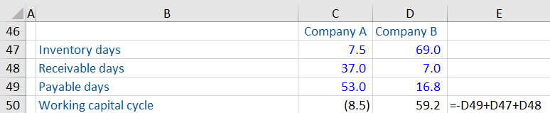 Company B has a working capital cycle of 59.2 days. The business gets inventory on day 1. On day 16.8, the business pays its suppliers. The inventory is not sold until day 69. The business gets cash only on day 76 (69+7). This is not an ideal situation as the business requires funding for 59.2 days.
