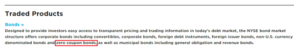 Issuers of zero coupon bonds include the US treasury, public corporations, and state and city government entities. Zero coupon bonds are traded on the bond markets of major stock exchanges like the NYSE. Here is a snapshot from the bonds page of the New York Stock Exchange.