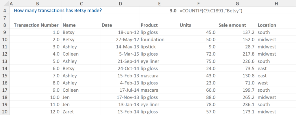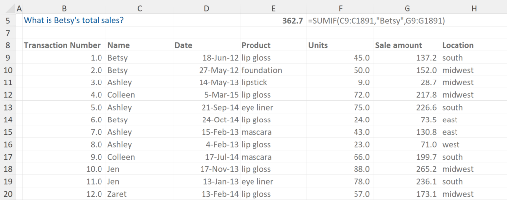 In this example we are asked what Betsy’s total sales are. The formula allows us to highlight the data range and then specify to sum the figures if they belong to Betty.