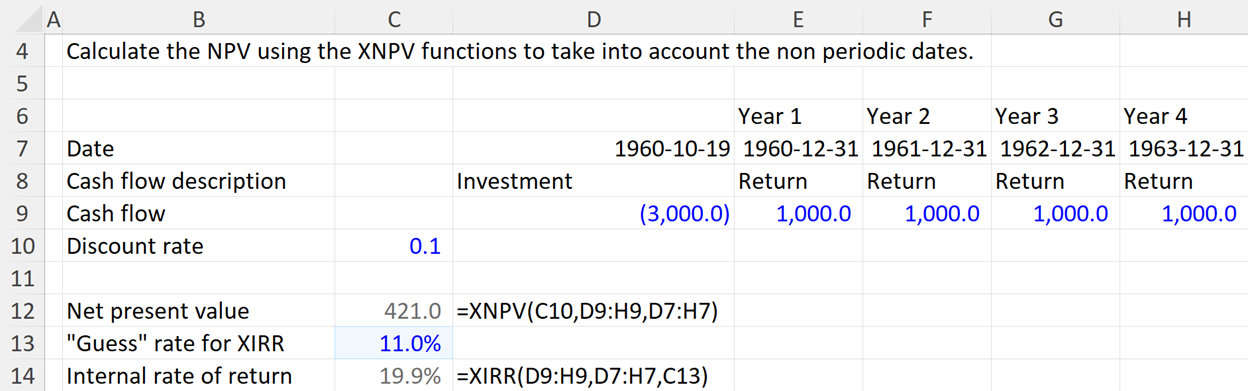 In this example we are asked to calculate the NPV using the XNPV function to take into account the non-periodic dates.