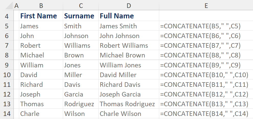 The CONCATENATE function joins several text items into one text item. Note that in newer versions of Excel, this function is replaced by =CONCAT.