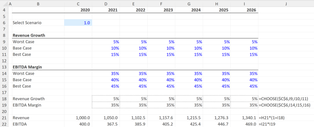 In this example, revenue growth and EBITDA margin are the assumptions used to calculate the projections. The analyst has created three scenarios: worst, base and best case for both these assumptions. Using the CHOOSE function, it is possible to create a dynamic model which switches between these assumptions, by changing the scenario number in cell C6.