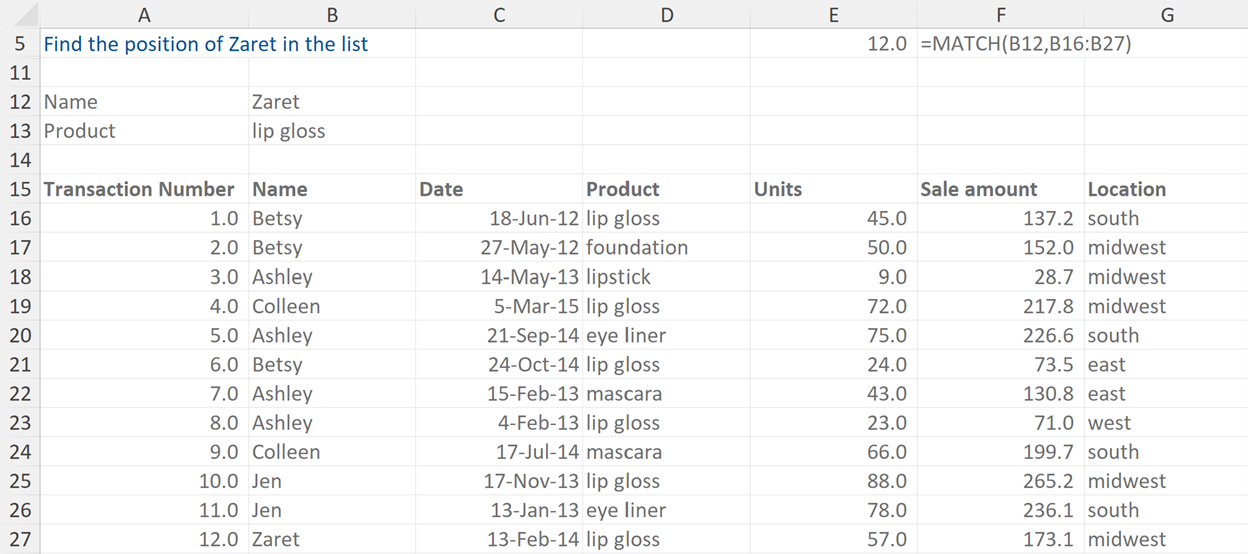 This example asks us to find the position of Zaret in the list. Zaret is 12th in the list of names so the match function returns 12 as the answer.