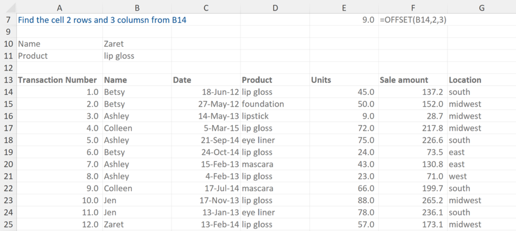 This example asks us to find the cell 2 rows (down) and 3 columns (right) from B14.