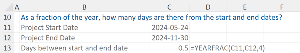 The example asks us, as a fraction of the year, how many days are there from the start and end dates?