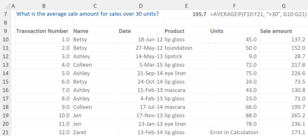 In this example we are asked what is the average sale amount for sales over 30 units?