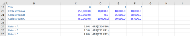 In this example we are asked to calculate the annual return for the below cash streams. Note that a negative value denotes a cash outflow for the investor.