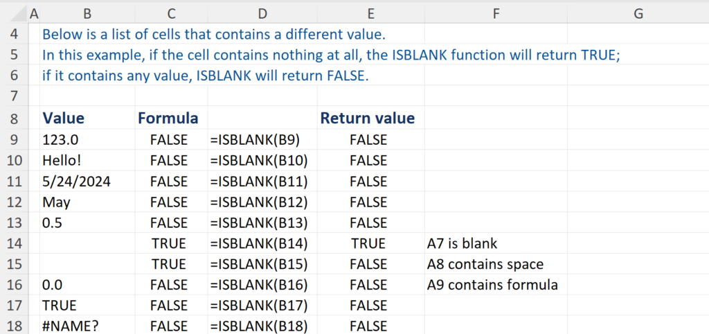 Below is a list of cells that contains a different value. In this example, if the cell contains nothing at all, the ISBLANK function will return TRUE. If it contains any value, including any space, text, number, date, time, month, year, percentage, logical value, formula or even error value, ISBLANK will return FALSE.