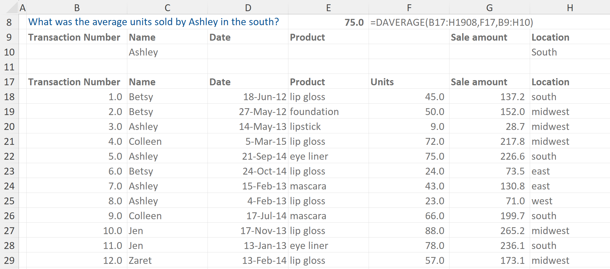 In this example we are asked what the average units sold by Ashley in the south is.