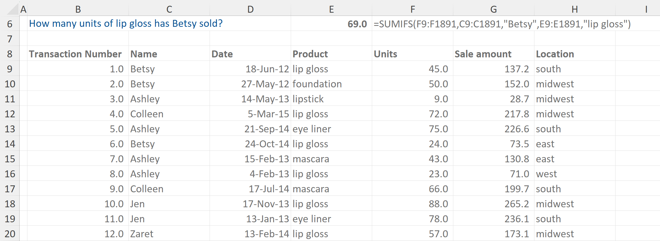 In this example we are asked how many units of lip gloss Ashley has sold. The formula firstly highlights the data range, then specifies that “unit” is found, and adds the conditions that it must match Ashley and lip gloss.