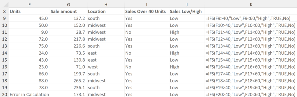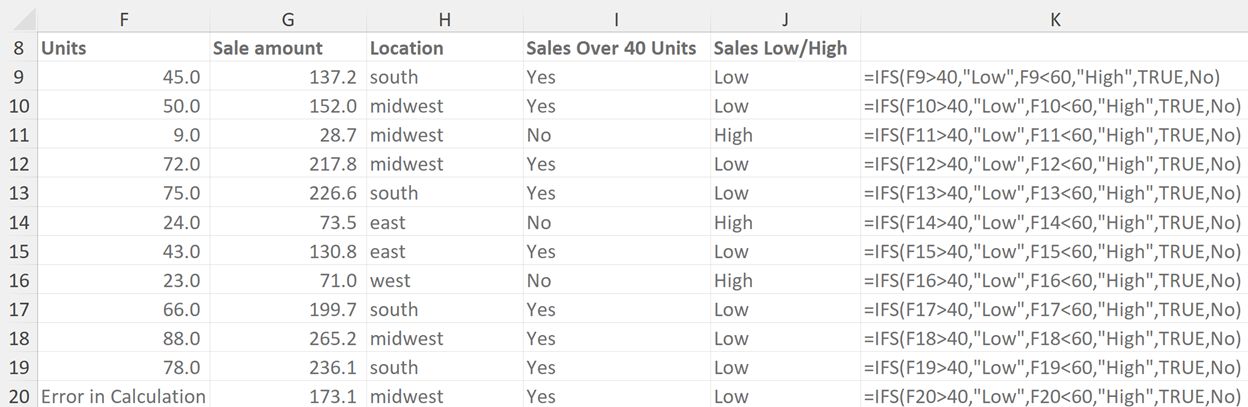 The example uses the IFS statement to identify units sold as low or high depending on whether the units sold are over 40 and if the sale amount is less than 60.