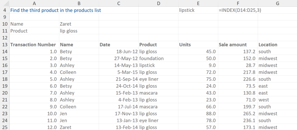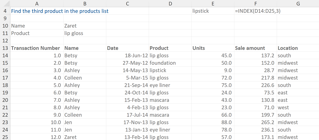 In this example we are being asked to find the third product in the products list. The formula highlights the data range and then specifies 3 as the data point to retrieve, which in this case is lipstick.