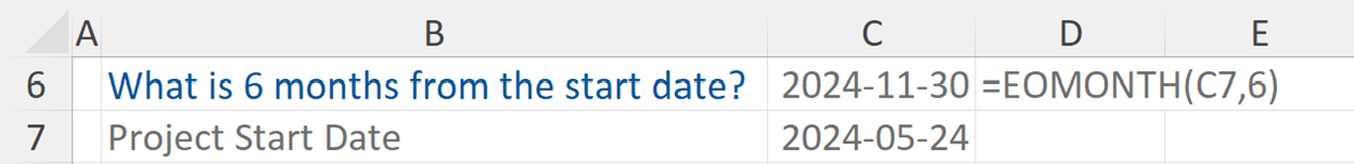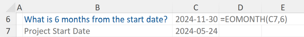 In this example we are asked what the date (end of the month) six months from the start date is. This is useful if we are looking to establish the potential completion date which will be six months later.