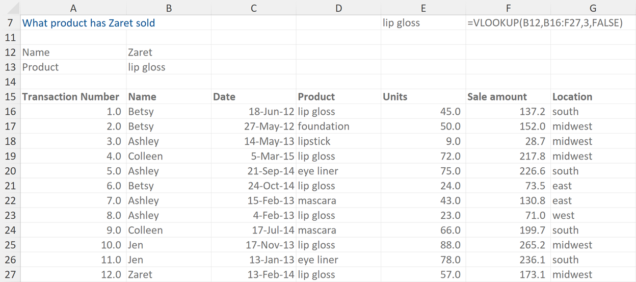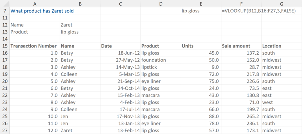 This example asks us to find out what product has Zaret sold. The formula highlights that it is searching for Zaret within the data range, and then requires an output from the 3rd column along in that particular row.