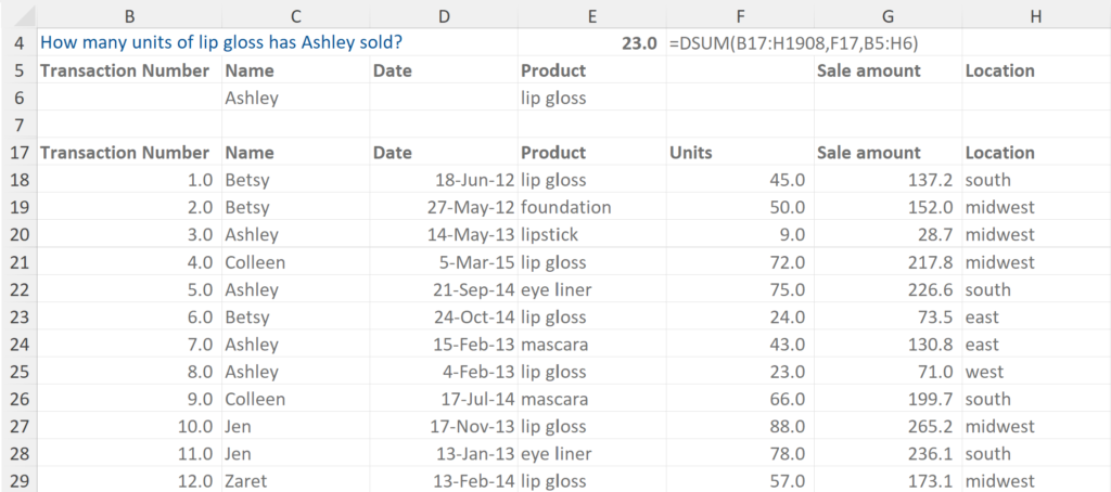 In this example we are asked what Ashley’s biggest sale in 2013 is. The DMAX formula is similar format to the DSUM formula above, but this time specifying the sales amount as the output.
