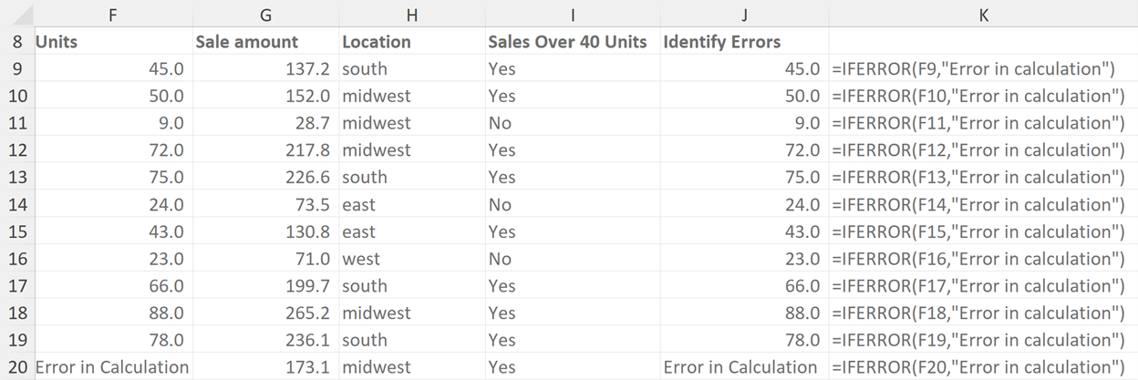 The formula entered here provides and “Error in Calculation” output if there are any errors within the data range. It could also provide a numerical output (e.g. 1 or 0) if error data was producing #REF or similar error message which were disrupting larger calculations using the data range.