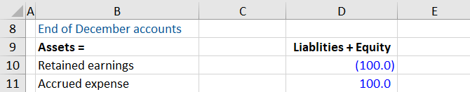A company estimates its electricity expense of 100 in November 20X9. However, the company will not receive the invoice until December 20X0. What is the effect on the company’s balance sheet?