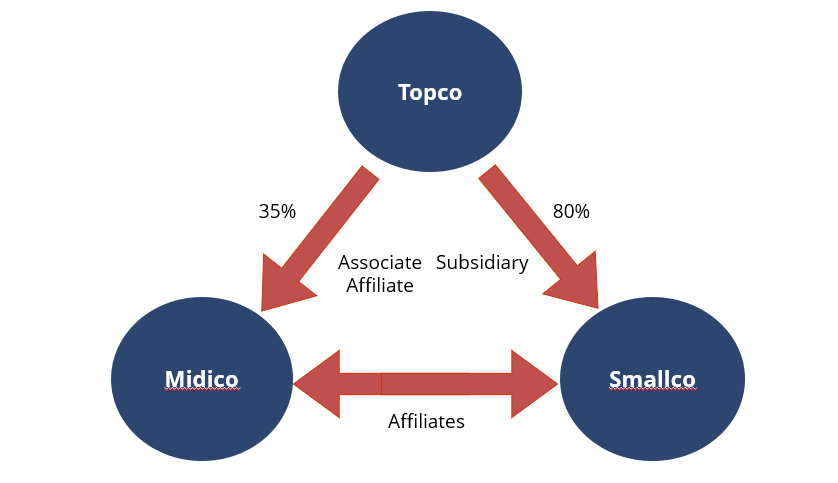 Here’s an example. Topco Ltd owns 35% of Midico Ltd, and also 80% of Smallco Ltd. Topco and Midico are affiliates, and Midico is also an associate of Topco (see our blog on associates). Smallco is a subsidiary of Topco Ltd. Midico and Smallco would consider themselves affiliates with each other, as they both have an equity investment relationship with Topco.
