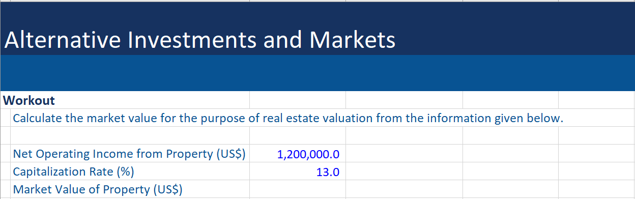 Given below is an example, where we assume that a commercial real estate in New York in the U.S. is expected to generate a net operating income of $1.2 million. If this is discounted at a capitalization rate of 13%, the market value of this property is calculated below i.e. US$ 9.23 million.