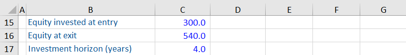 In the case where there are only two cash flows (the original investment and the exit value), the IRR is calculated using the Compound Annual Growth Rate (CAGR) as follows: